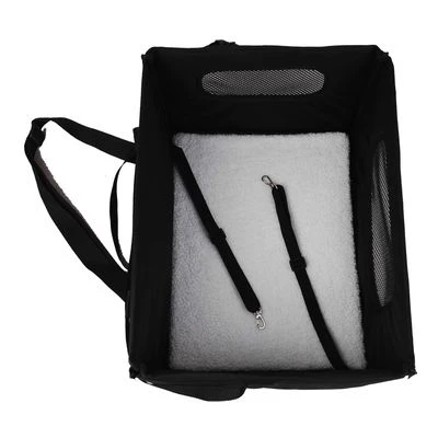 Asiento cómodo para perros y gatos de tamaño pequeño. Dispone de un cojín de felpa para mayor comodidad y de dos cinturones de seguridad para garantizar la estabilidad durante los trayectos en coche.
