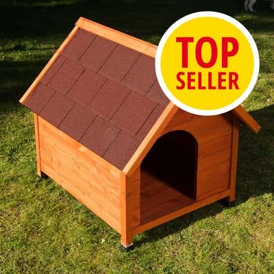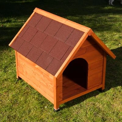 Caseta para perros fabricada con madera impermeabilizada de pino de explotación sostenible. Con techo a dos aguas de cartón asfaltado reforzado con saliente protector. Patas regulables.