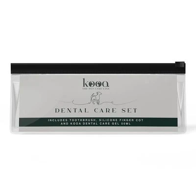 El set para la higiene dental de kooa aporta todos los utensilios que necesitas para la limpieza dental de tu peludo.Contiene un cepillo de dientes con un cabezal grande y otro pequeño, un dedil de silicona y un gel dental vegano con sabor a pollo.